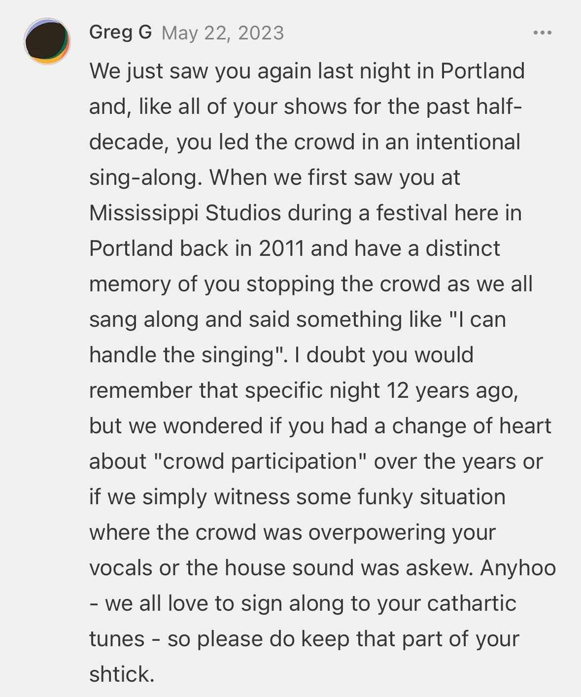 Ahh, this just makes my heart swell! The difference between being a great artist and being an impactful one is crowd engagement. How cool is it to hear that a human being invites, welcomes, and accepts other human beings while at their best and in their own skin?! Keep up the great work, Dan!